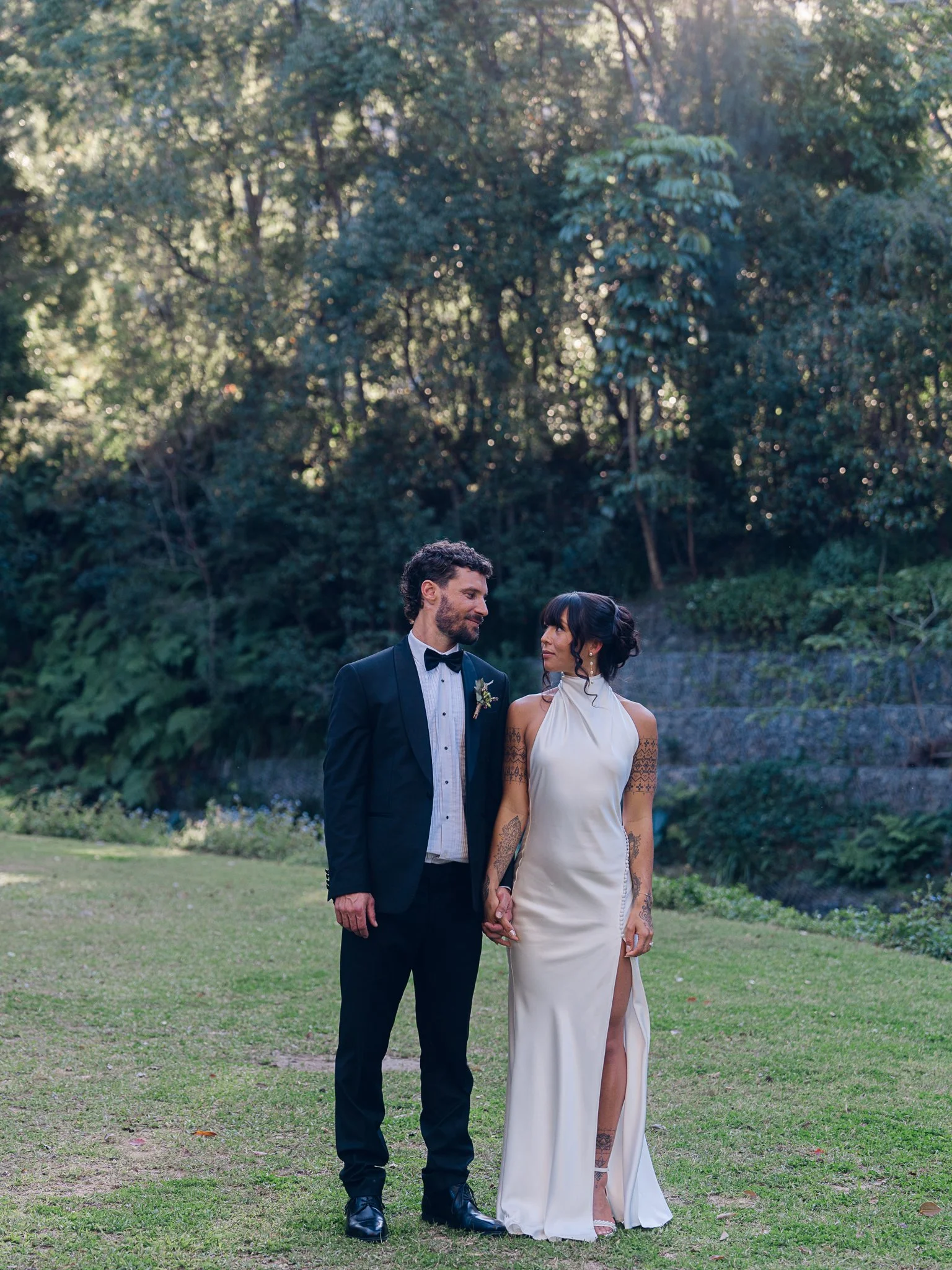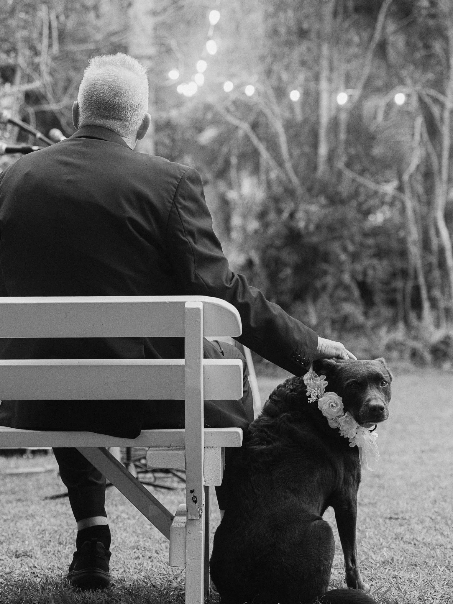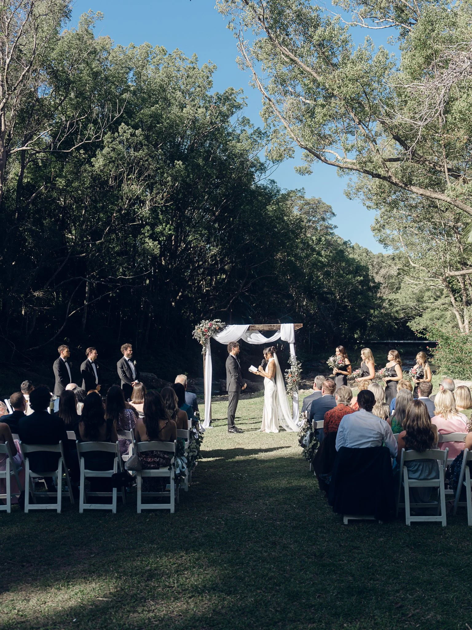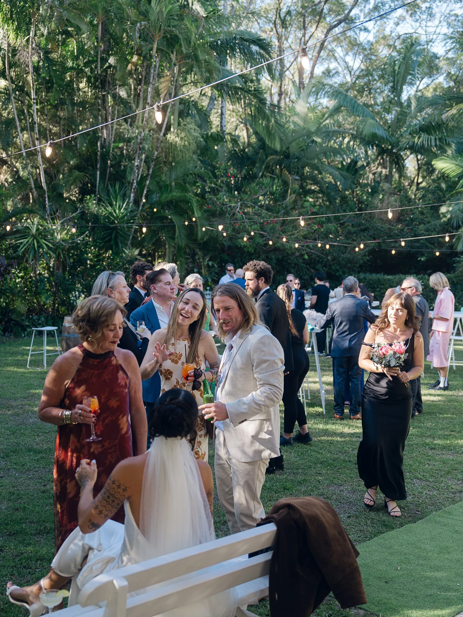 Dana and Jake celebrated their love with a warm, intimate garden party surrounded by family, close friends, and their beloved pup Luna. Nestled in the peaceful Currumbin Valley, this enchanting rainforest wedding took place at the stunning Sol Gardens—a hidden seven-acre oasis of lush greenery, tranquil creeks, ponds, vibrant gardens, and beautifully flowing outdoor spaces.