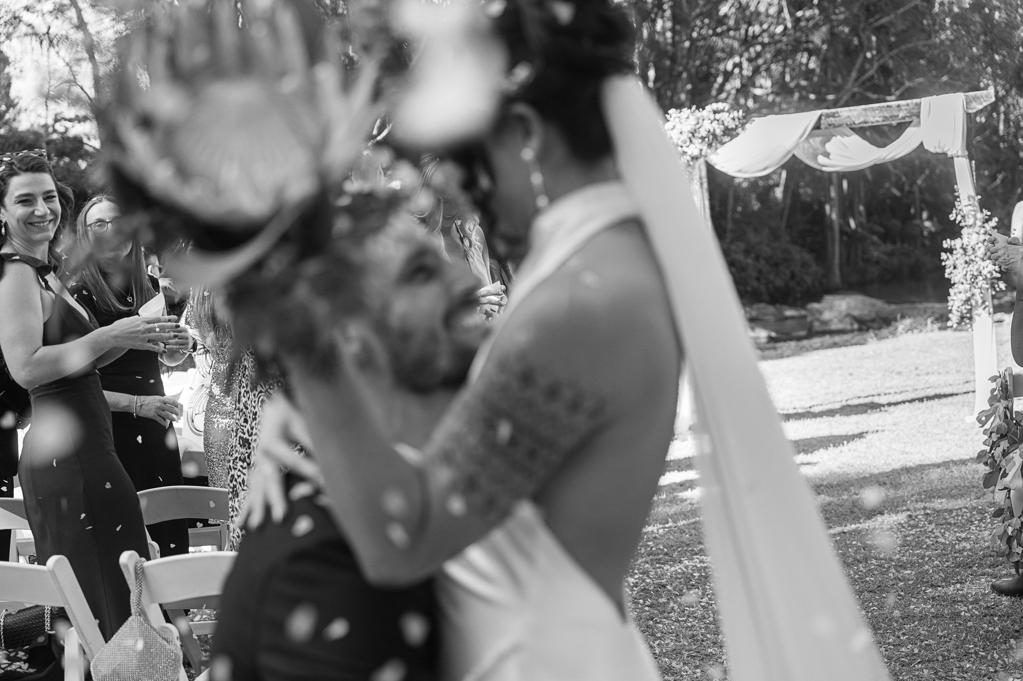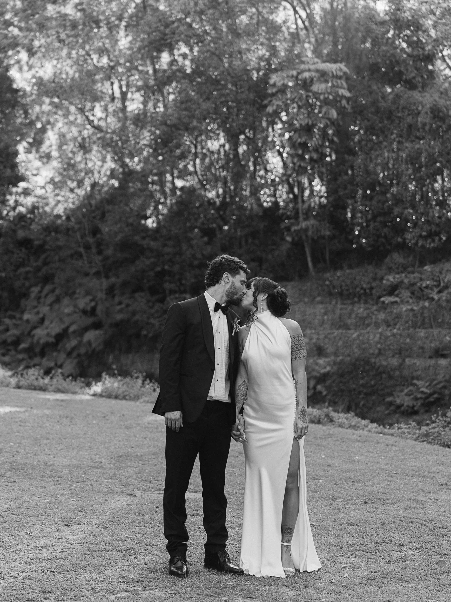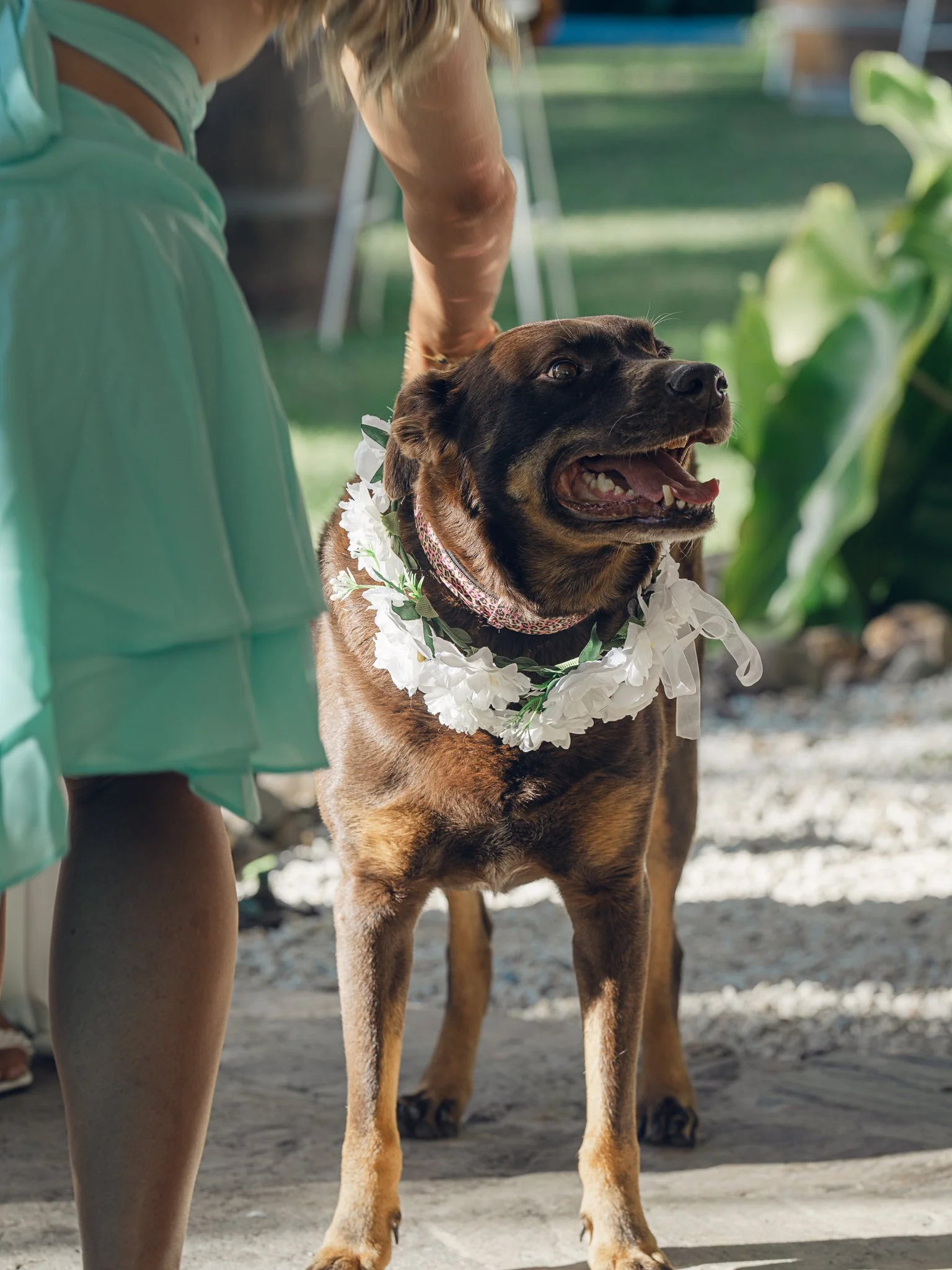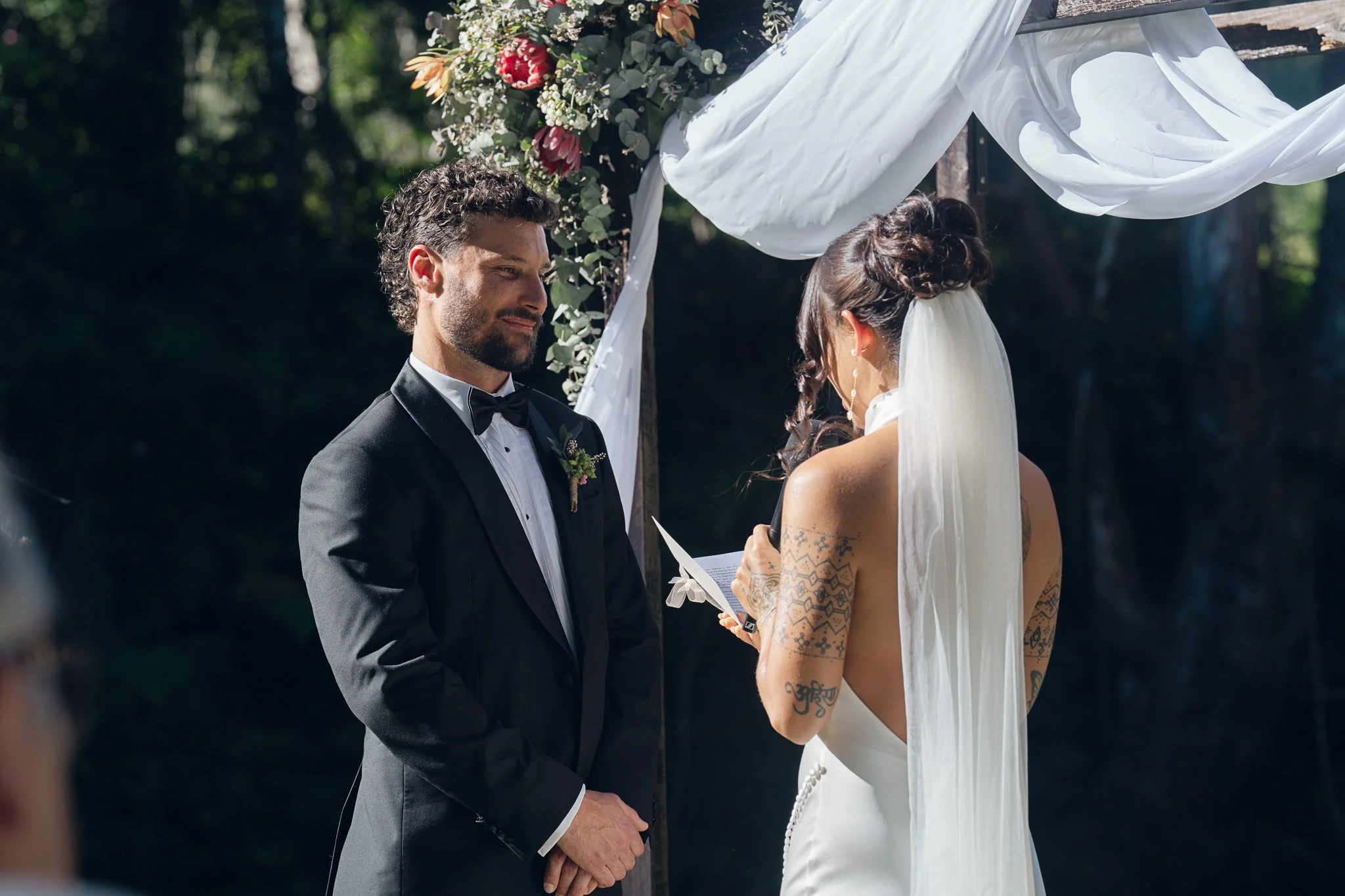 Dana and Jake celebrated their love with a warm, intimate garden party surrounded by family, close friends, and their beloved pup Luna. Nestled in the peaceful Currumbin Valley, this enchanting rainforest wedding took place at the stunning Sol Gardens—a hidden seven-acre oasis of lush greenery, tranquil creeks, ponds, vibrant gardens, and beautifully flowing outdoor spaces.